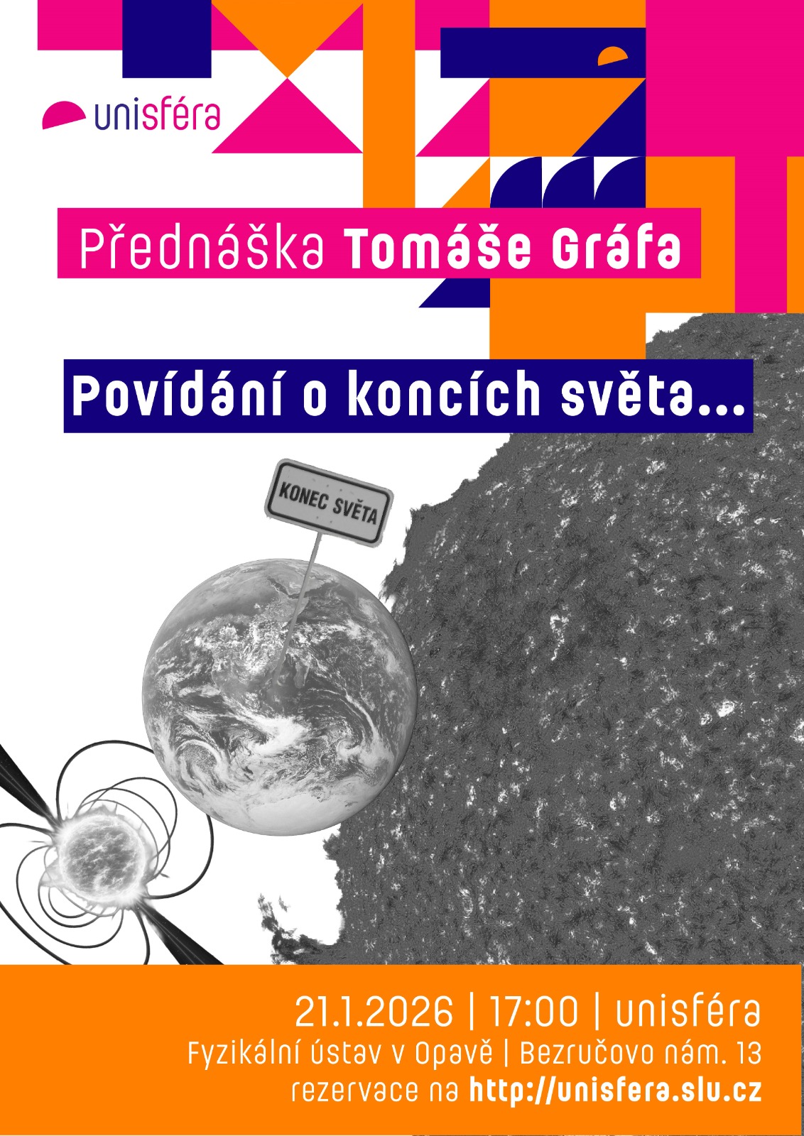 Ve středu 21. ledna 2026 od 17 hodin se v opavském planetáriu a sférické projekci Unisféra Fyzikálního ústavu v Opavě na Bezručově náměstí 13 uskuteční vskutku jedinečná přednáška. Její lektor, RNDr. Tomáš Gráf, Ph.D., si připravil nezvyklé „Povídání o koncích světa“. Téma, které fascinuje i zneklidňuje lidstvo už po staletí, je opředeno nejrůznějšími tajemstvími, mýty, ale přináší také zamyšlení nad realistickými scénáři. Jaké to jsou? Přijďte to zjistit do Unisféry.